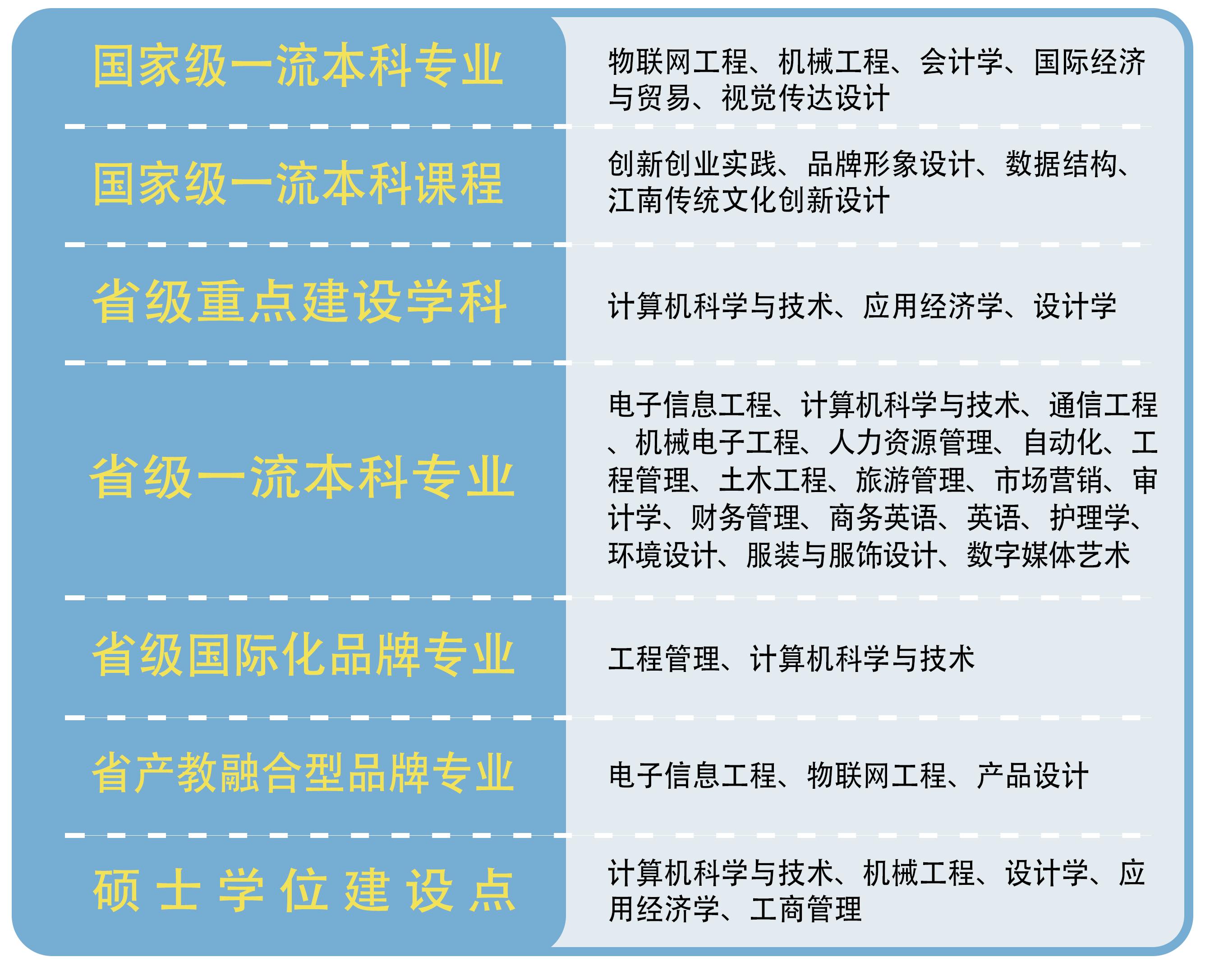 答:我校有物联网、集成电路、智能制造、智能建筑、生产性服务业、文化创意、健康护理七大专业群,拥有5个国家级一流本科专业,位居全国同类高校前列,获4门国家级一流本科课程,3个省级重点建设学科,18 个省级一流本科专业(具体见右上列表)。近年来新增了药学、人工智能、智能建造、集成电路设计与集成系统、数据科学与大数据技术等市场紧缺的热门专业。